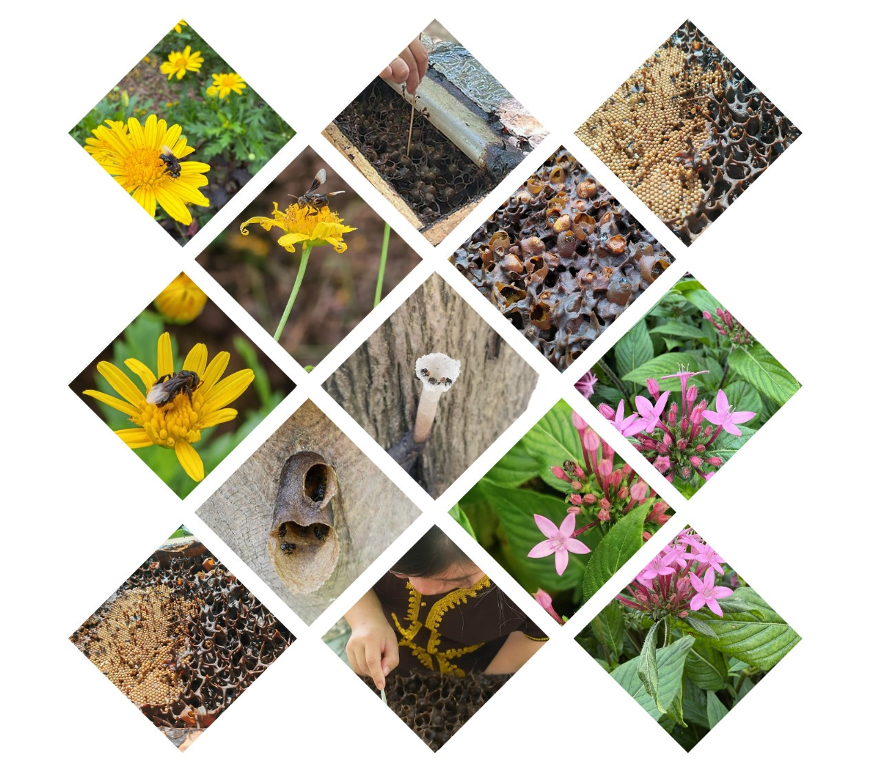 スティングレス・ビー(針無し蜂)はミツバチに近縁な昆虫の一群で、約500種が知られており、わずか7種しかいないミツバチをはるかに上回ります。針無し蜂は針の構造を保持していますが、非常に退化しており、実質的に刺す機能は失われています。
